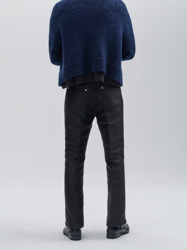 - 실크 미카도 원단과 유사한 폴리 원단을 염색하여 제작한 부츠 컷 핏의 5포켓 팬츠입니다.