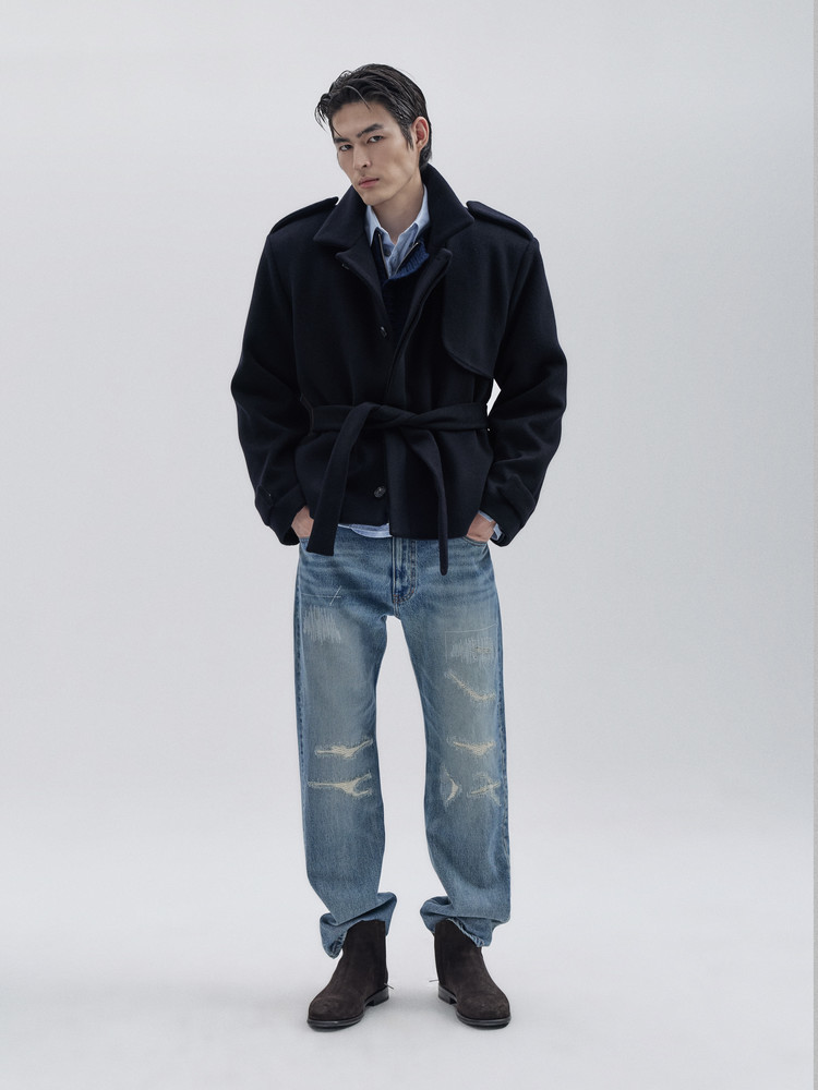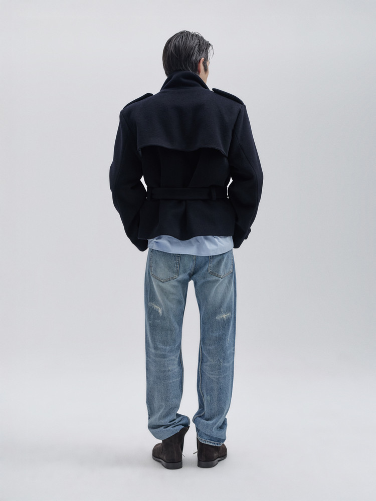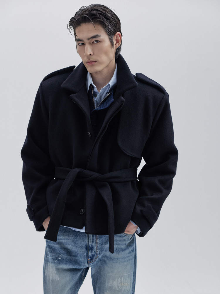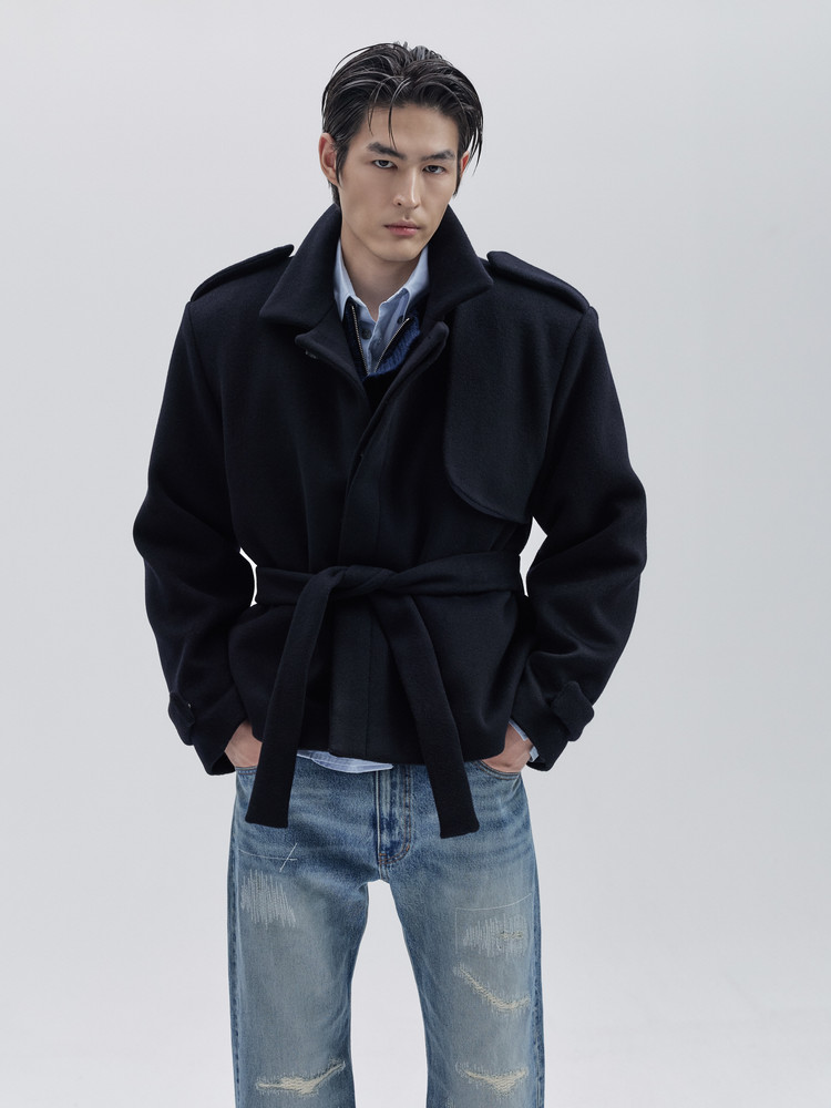 - 다크한 네이비 컬러의 부드러운 울 소재를 사용한 트렌치 점퍼입니다.