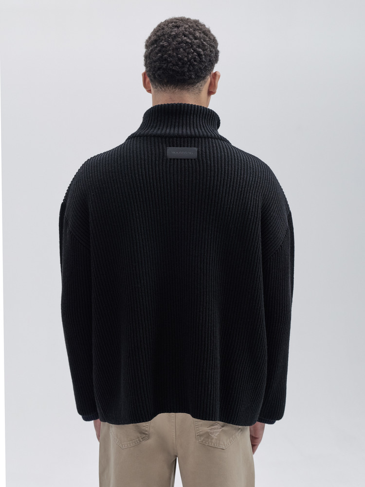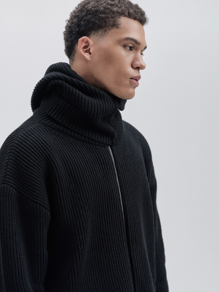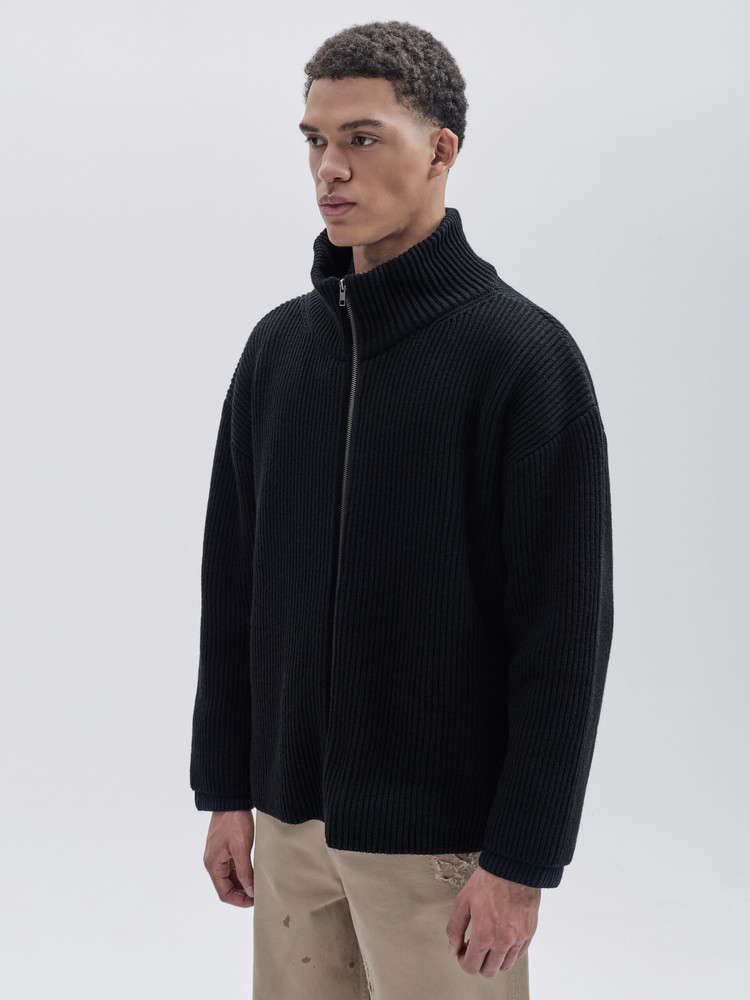 - 중량감 있는 울 소재로 청키한 립 짜임의 집업 니트입니다.