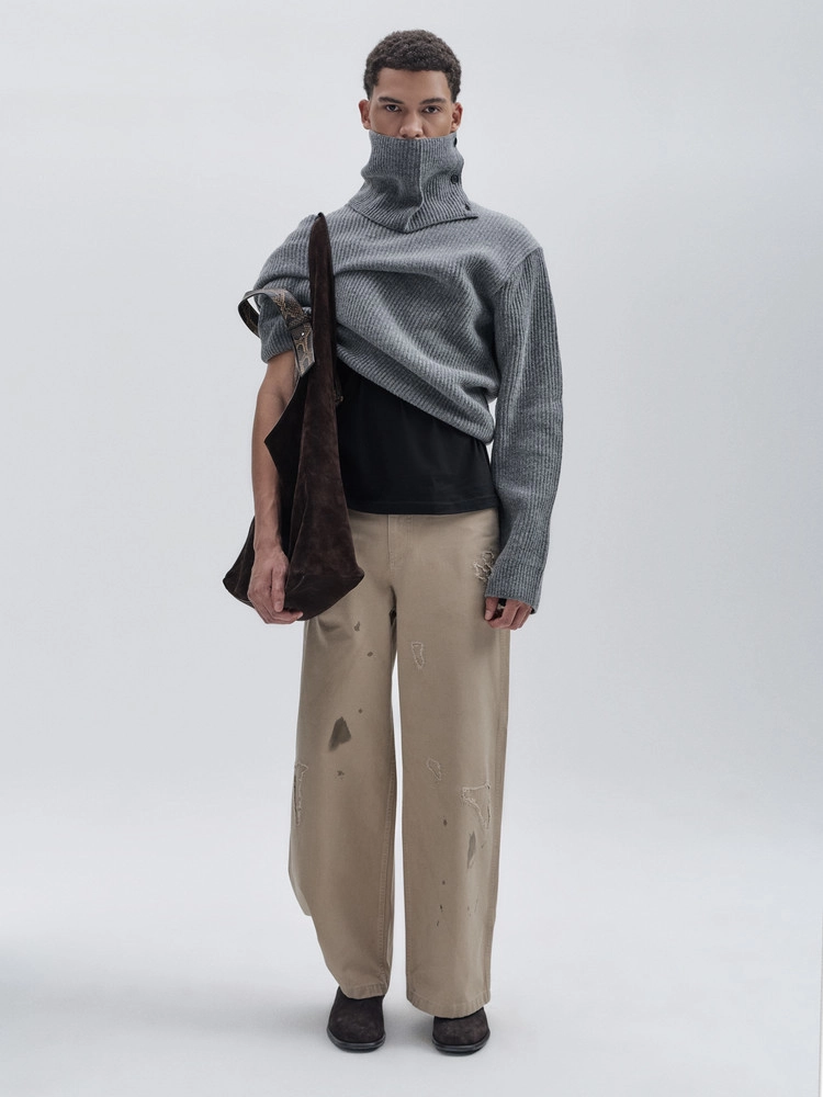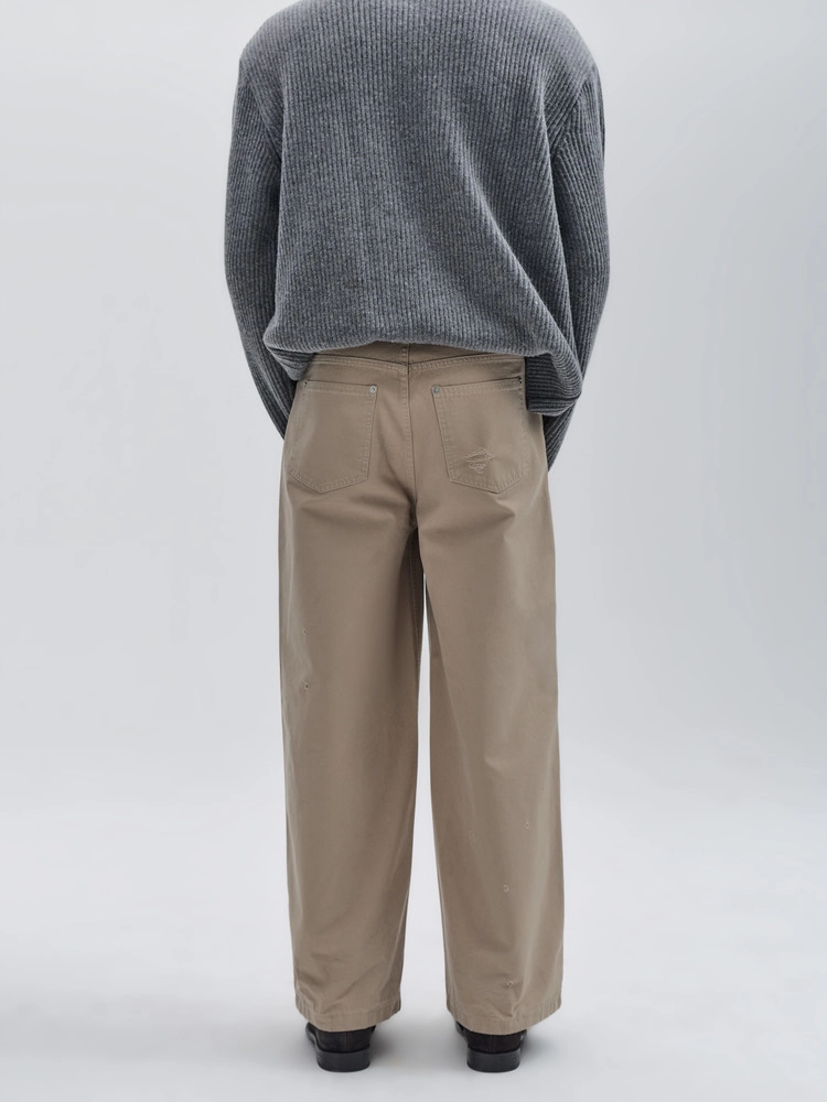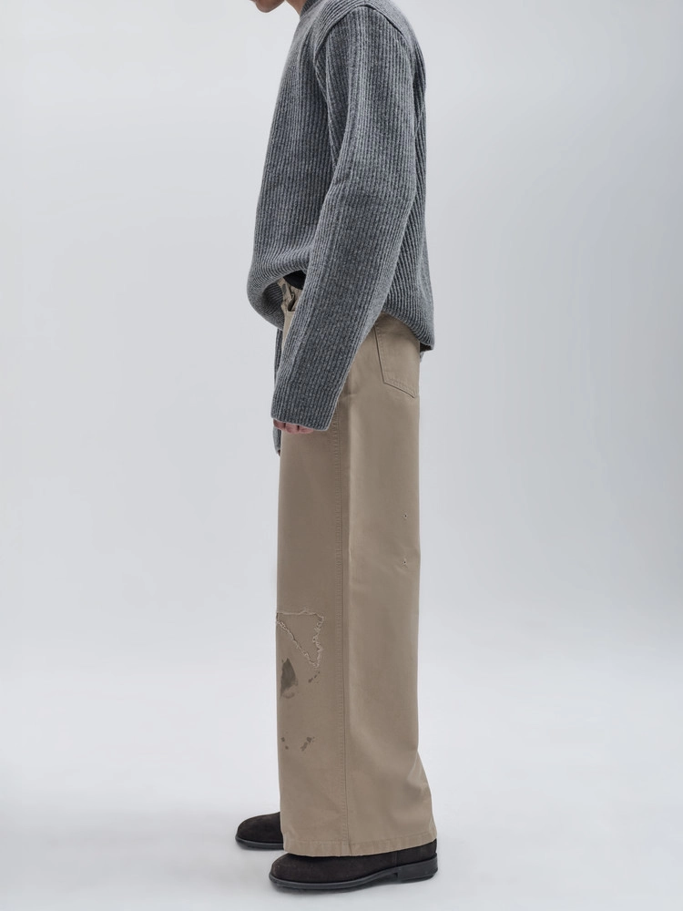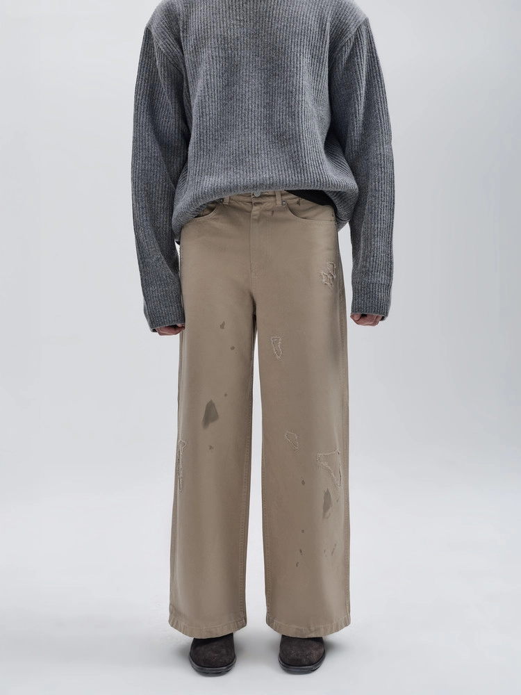 - 찢어진 부분에 같은 원단으로 덧대고, 러프한 느낌의 스티치를 사용한 것이 큰 특징인 팬츠입니다.